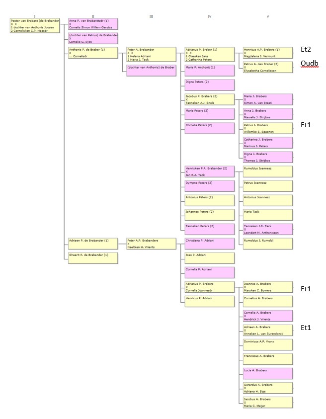 Geneagram Brabers In het geneagram links staan de eerste vijf generaties van de genealogie Brabers uit Etten, tak 1 (Et1). Rechtsboven in de 4e generatie staat Adrianus Petersz Braber (I) Via zijn oudste zoon Henricus Adrianus Peters Brabers, geboren 1619 (II) wordt er vervolgd in deze genealogie Brabers uit Etten, tak2 (Et2). Via zijn tweede zoon Petrus Adriaensen den Braber, geboren 1624 (I-2) wordt er vervolgd in het Oudenbossche geslacht den Braber (Oudb). De Ettense Brabers, tak 1 (Et1) vervolgen via 3 personen, aangeduid met Et1 rechts. Al deze 5 takken lopen door tot heden. |
